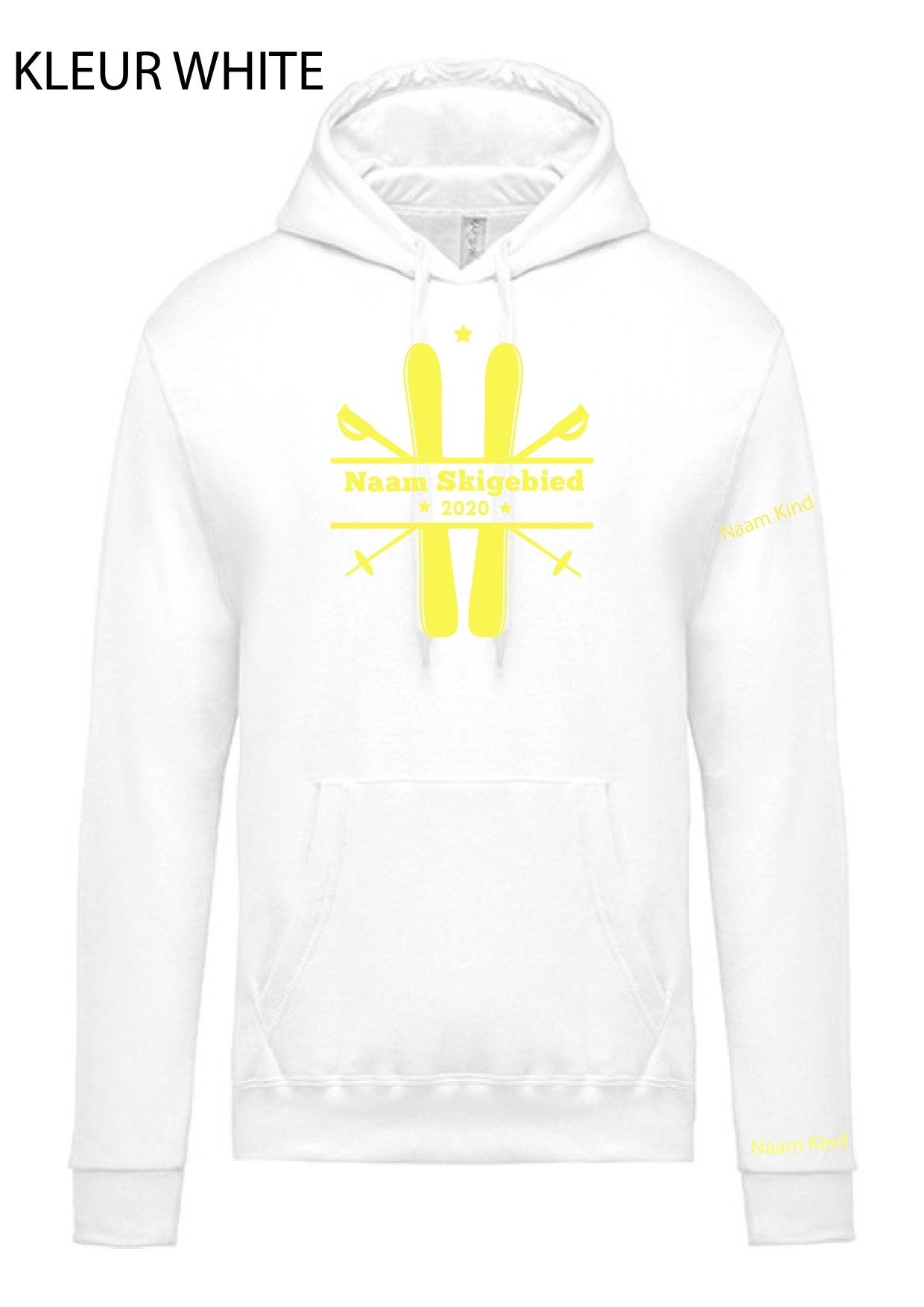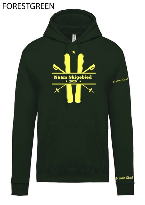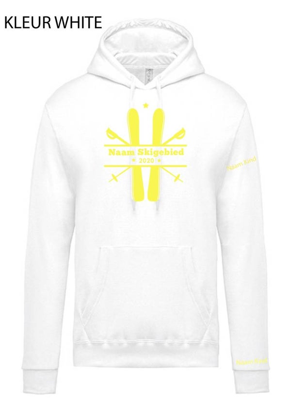LEUKE WARME SKI SWEATER VOOR KINDEREN MET EIGEN NAAM OP MOUW EN OP VOORZIJDE DE NAAM VAN HET SKIGEBIED met eronder jaartal 2020.