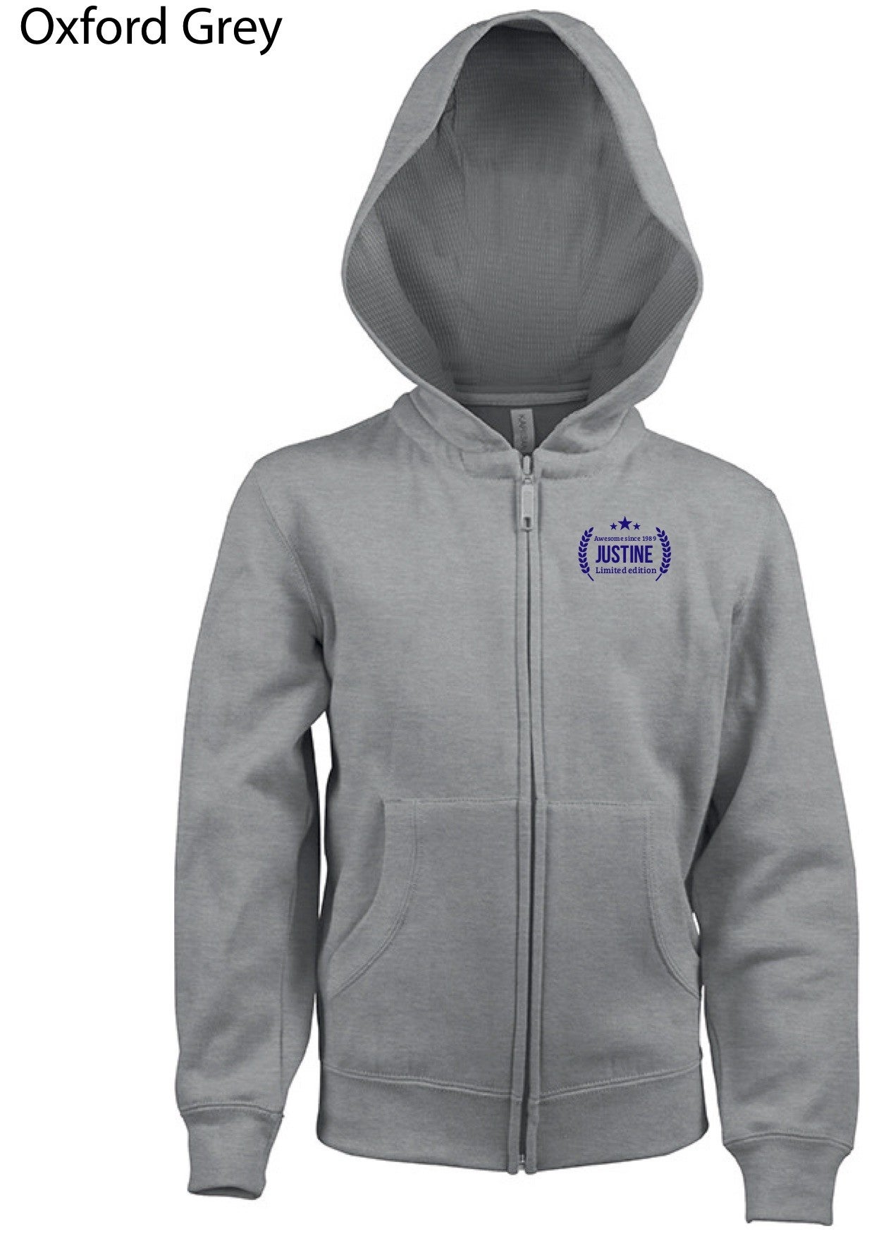 80% gekamd katoen / 20% polyester. Geborsteld fleece aan de binnenkant. Nektape in contrastkleur. (Navy voor de kleur Oxford Grey en Oxford Grey voor alle andere kleuren). Gevoerde capuchon in honinggraatstructuur. 'Kangaroe' zakken. Afwerking in rib aan de zakken, mouwuiteinden en onderaan. Ritssluiting.