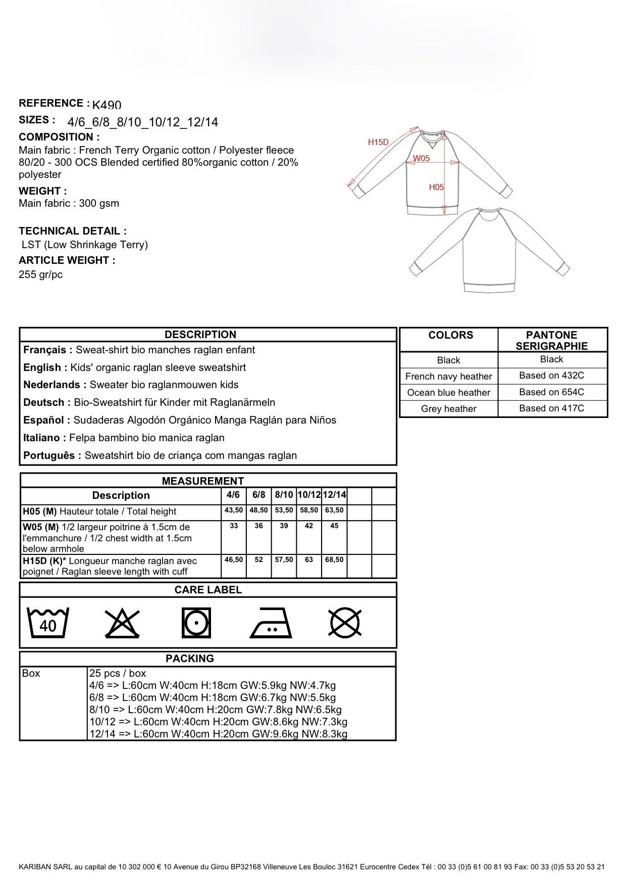 80% biologisch katoen / 20% Polyester OCS Blended gecontroleerd door Ecocert Greenlife. French Terry. LST (Low Shrinkage Terry). Modieuze snit. Rib boord aan halsopening, mouwuiteinden en aan de onderkant. Nektape in twill aan de binnenzijde van de kraag en V-afwerking aan de halsopening