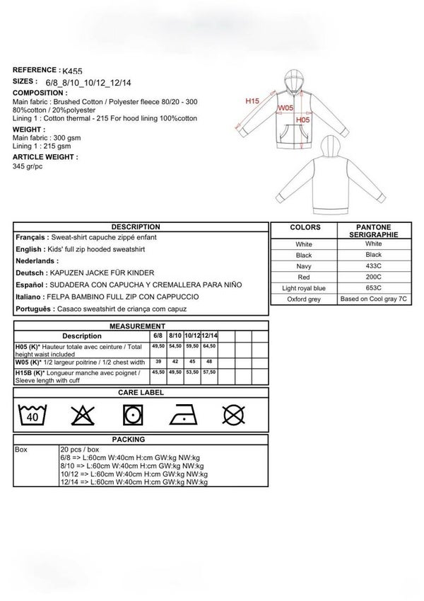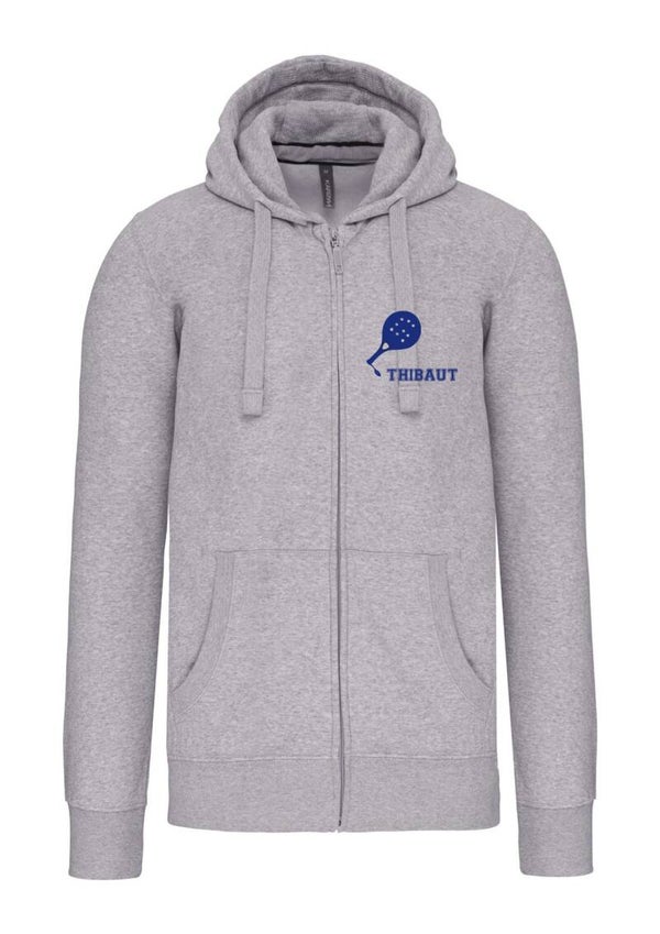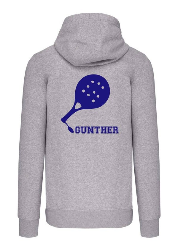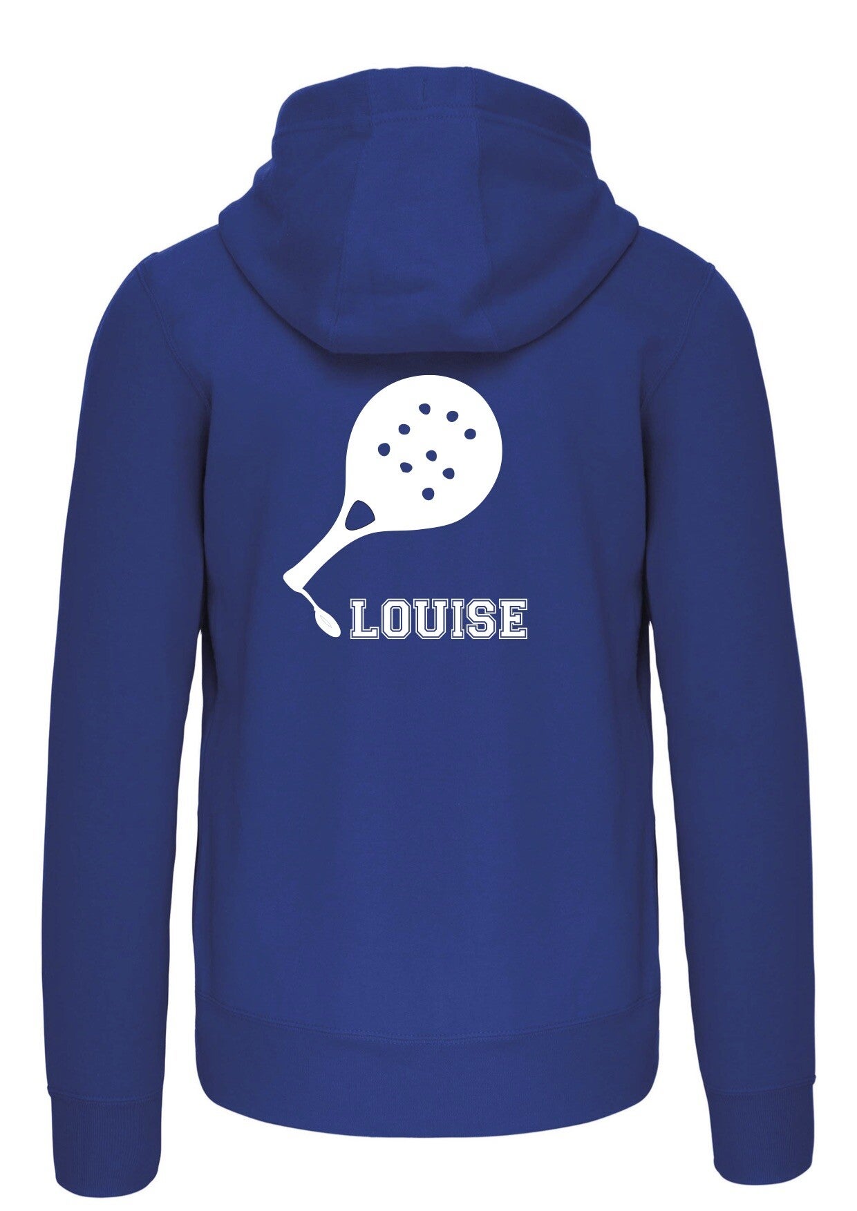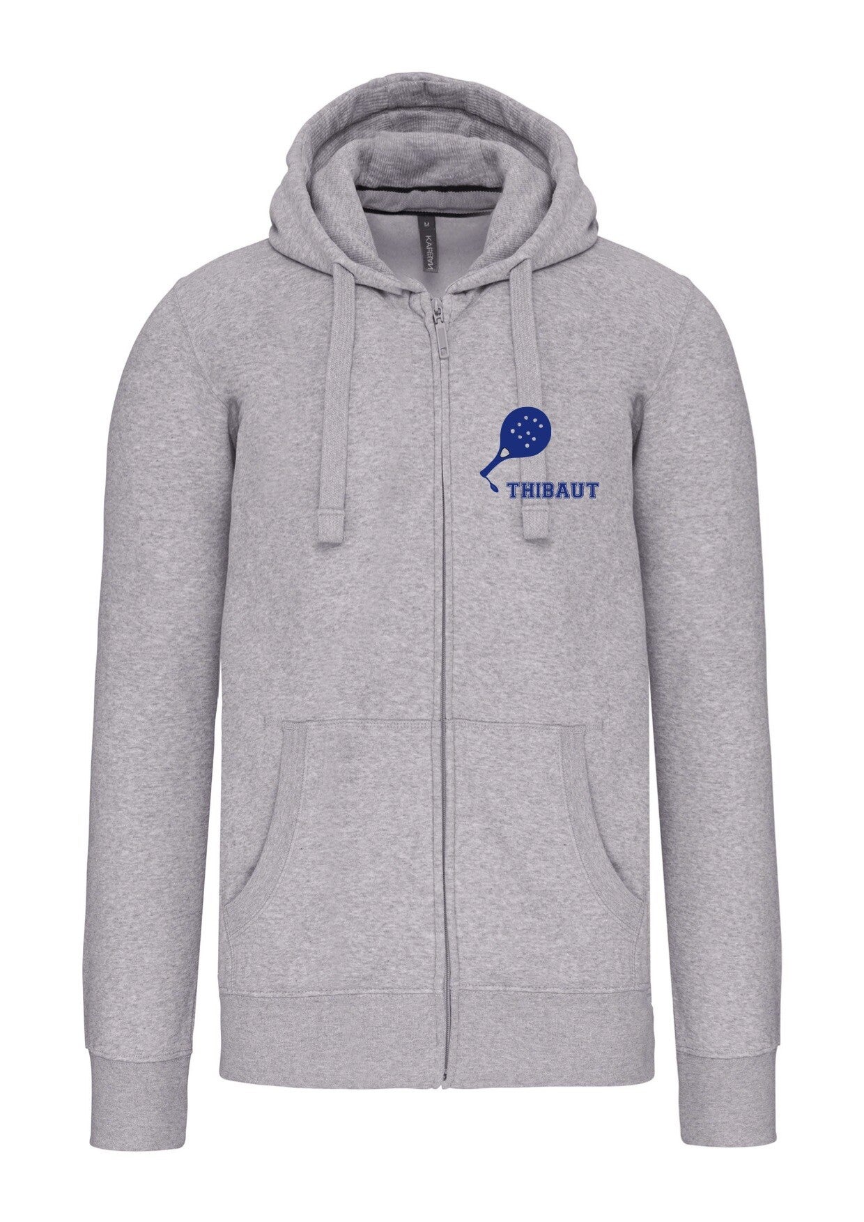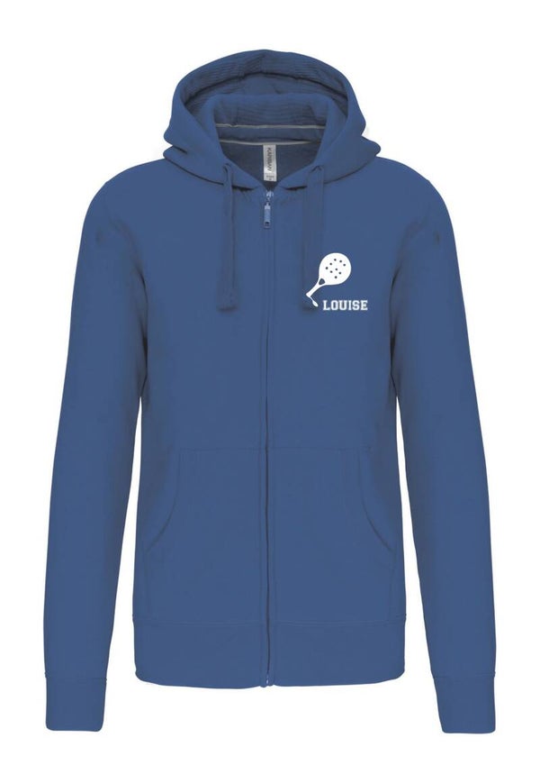 Coole sweater met eigen naam en Padel logo. Beschikbaar in Royal bleu of oxford grey. Warme sweater 300 gr ,80% gekamd katoen/ 20% polyester. Geborsteld fleece aan de binnenkant. Nektape in contrastkleur. (Navy voor de kleur Oxford Grey en Oxford Grey royal bleu). Gevoerde capuchon in honinggraatstructuur met aanrijgkoordje. 'Kangaroe' zakken. Afwerking in ribaan de zakken, mouwuiteinden en onderaan. Ritssluiting.