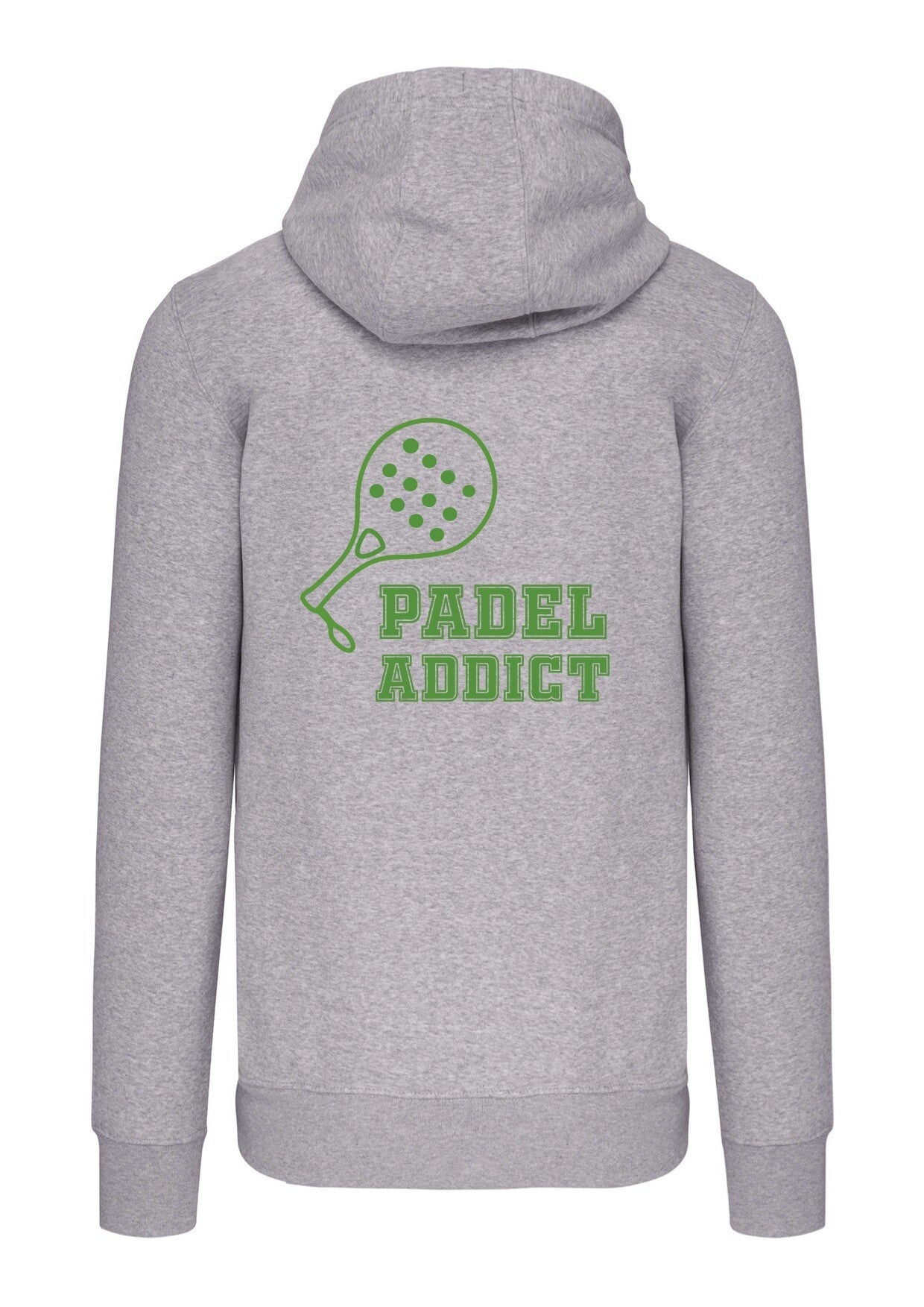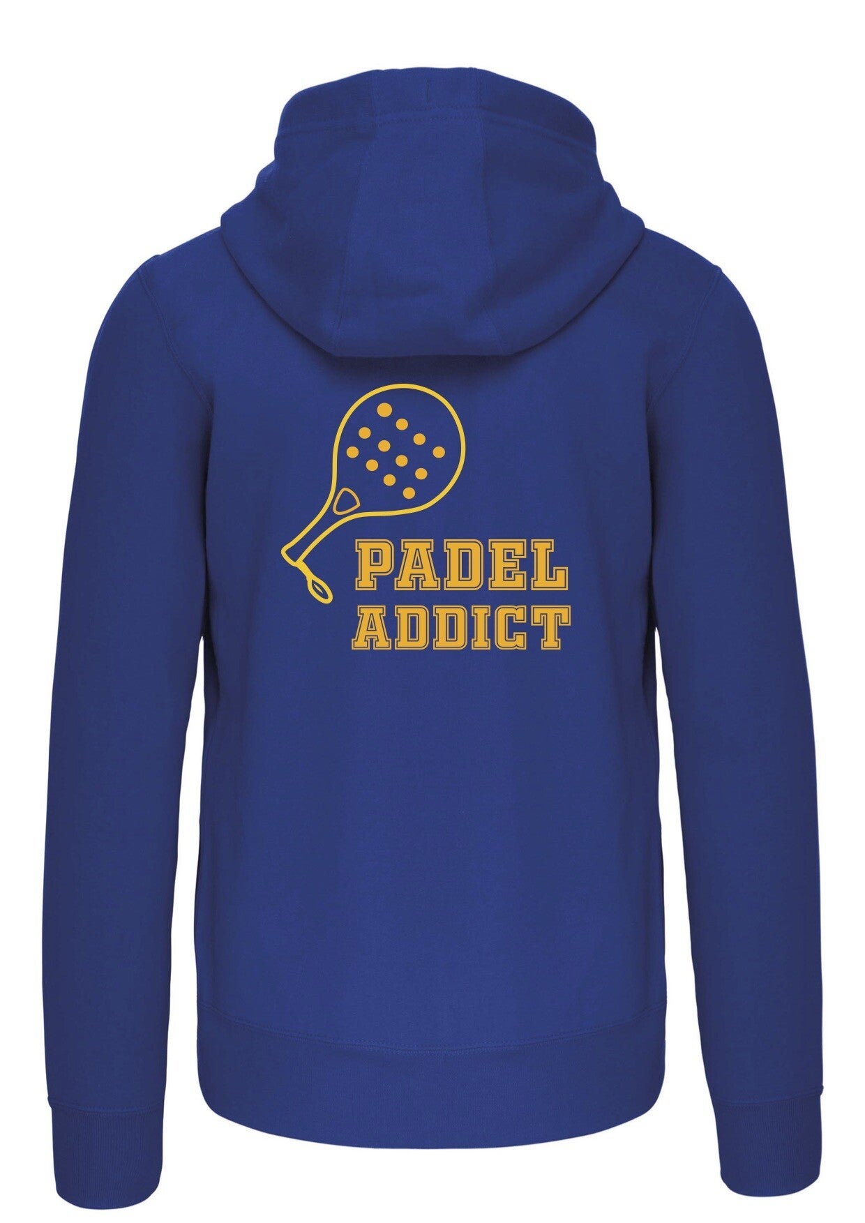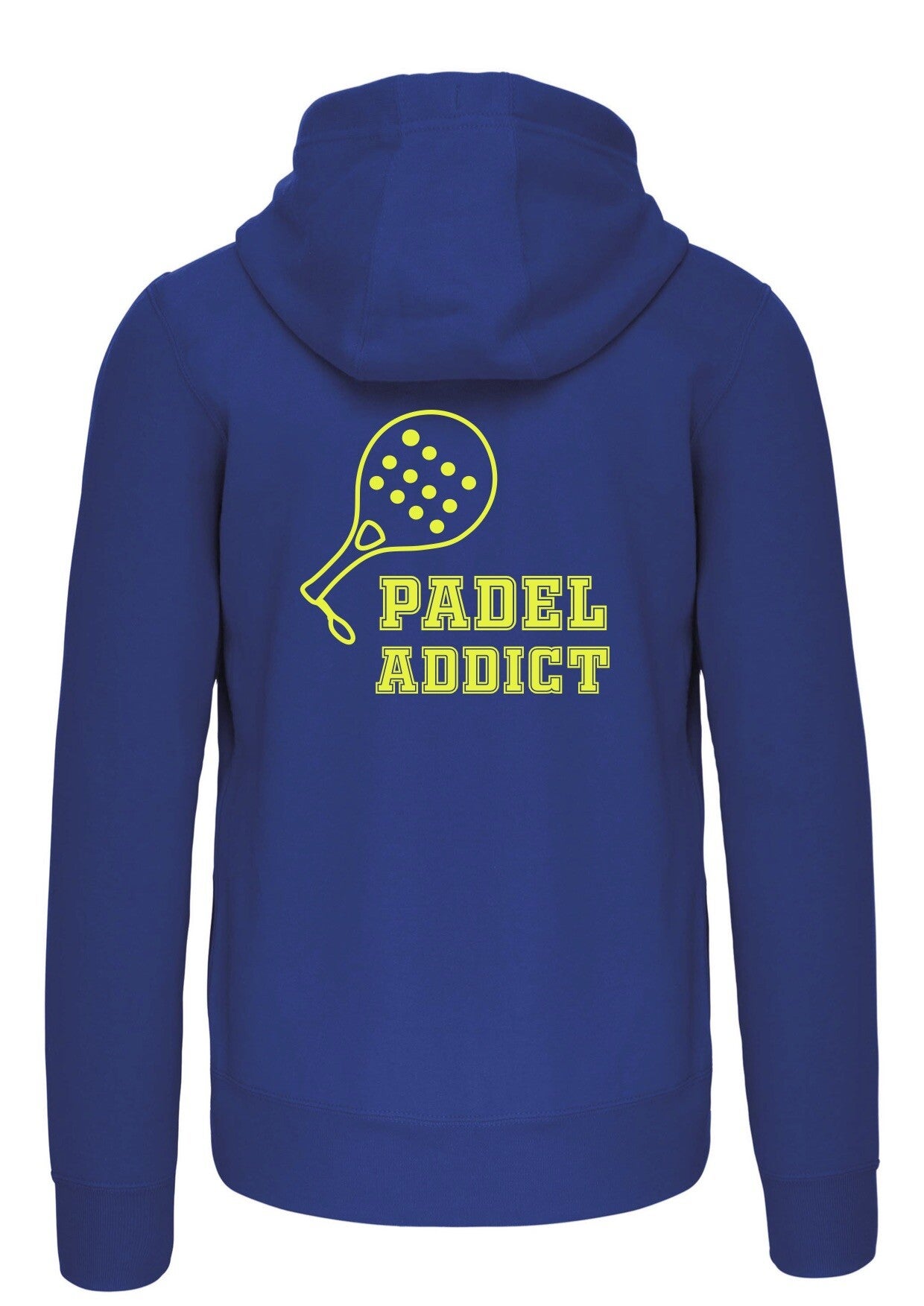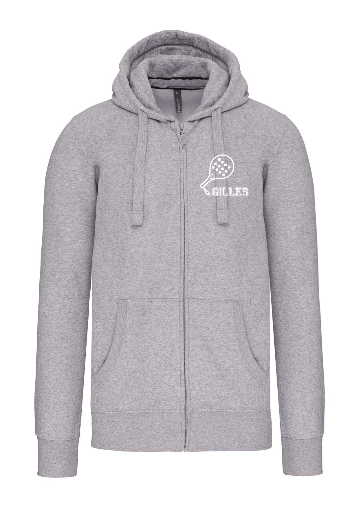 Coole sweater met eigen naam en Padel logo. Beschikbaar in Royal bleu of oxford grey. Warme sweater 300 gr ,80% gekamd katoen / 20% polyester . Geborsteld fleece aan de binnenkant. Nektape in contrastkleur. (Navy voor de kleur Oxford Grey en Oxford Grey royal bleu). Gevoerde capuchon in honinggraatstructuur met aanrijgkoordje. 'Kangaroe' zakken. Afwerking in rib aan de zakken, mouwuiteinden en onderaan. Ritssluiting.