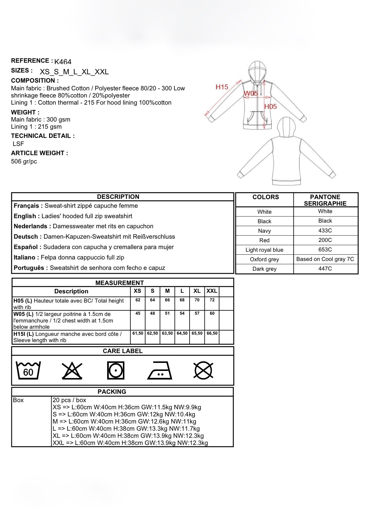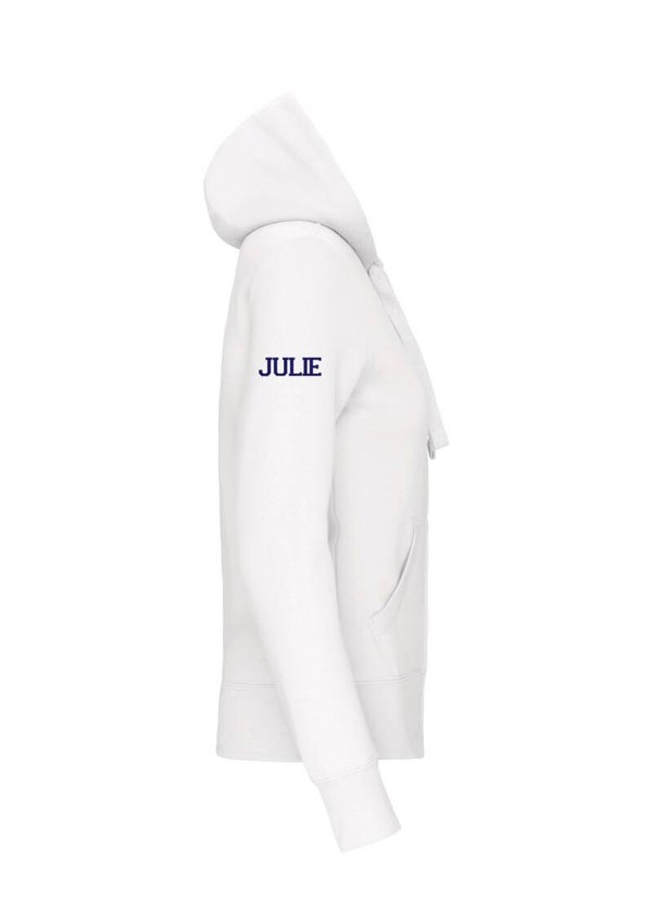 80% gekamd katoen / 20% polyester . Geborsteld fleece aan de binnenkant. Nektape in contrastkleur. Gevoerde capuchon in honinggraatstructuur. 'Kangaroe' zakken. Afwerking in rib aan de zakken, mouwuiteinden en onderaan. Ritssluiting.